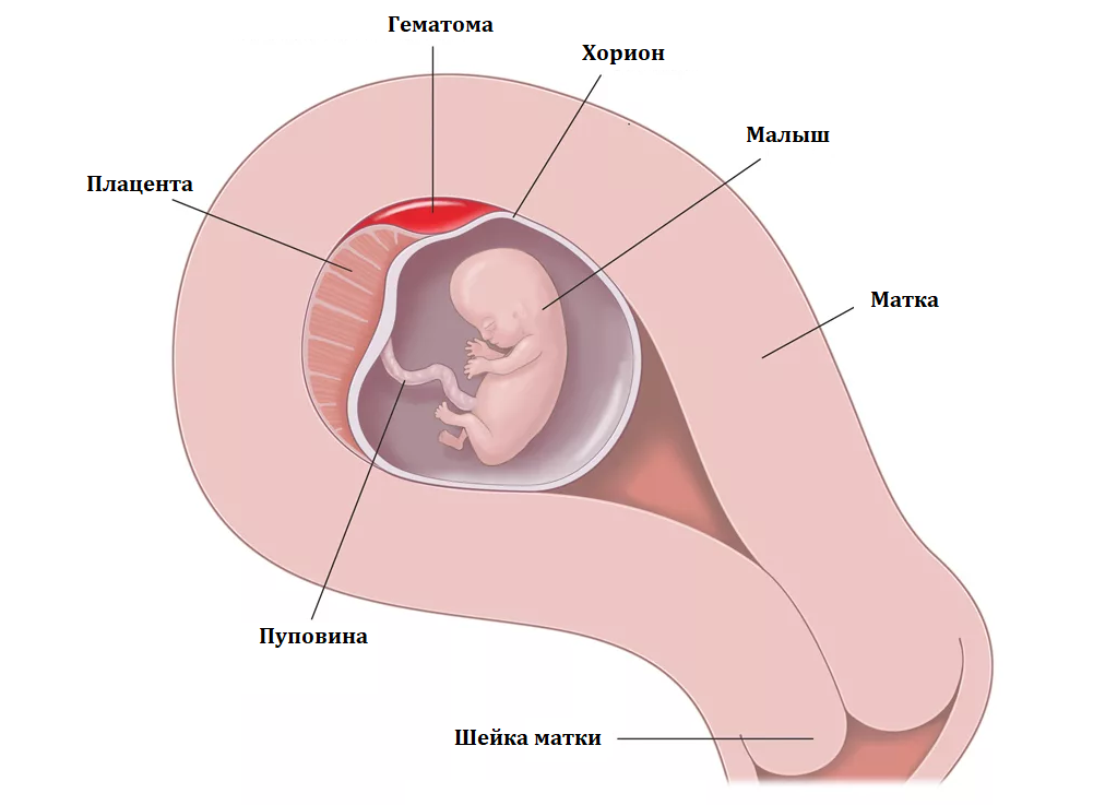 Чаще всего гематома появляется при угрозе прерывания беременности — при гипертонусе матки плодное яйцо немного отслаивается от ее стенки, что приводит к кровотечению. При этом кровь может скапливаться между плодными оболочками и маткой, а может опорожняться, при этом у беременной появляются кровянистые выделения различной интенсивности.